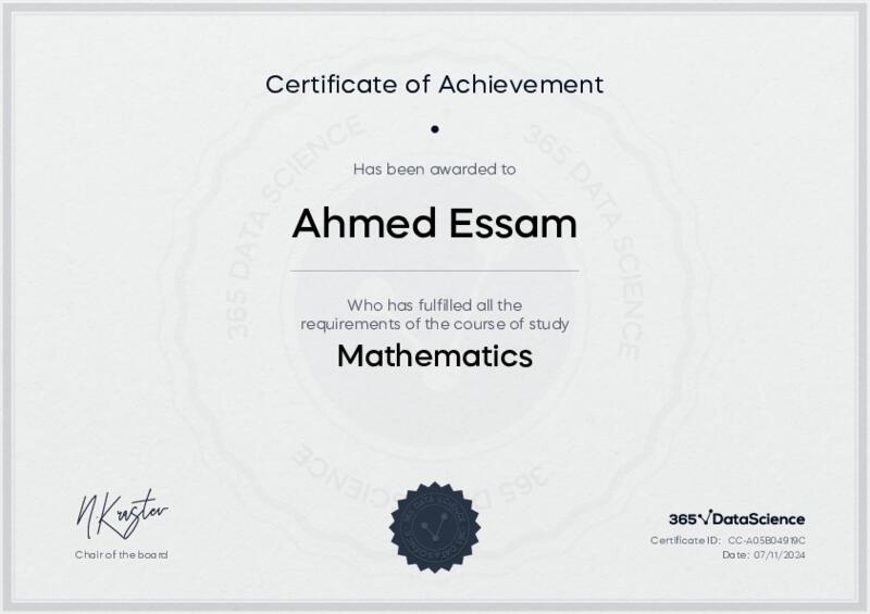 This user has been awarded the Mathematics Certificate for successfully completing the course exam. Holding this certificate demonstrates their proficiency on the topic and signifies they are qualified to apply their newly acquired expertise in the fields of data analytics and data science.