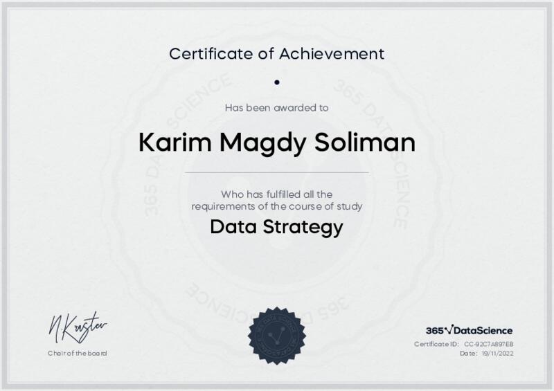 This user has been awarded the Data Strategy Certificate for successfully completing the course exam. Holding this certificate demonstrates their proficiency on the topic and signifies they are qualified to apply their newly acquired expertise in the fields of data analytics and data science.