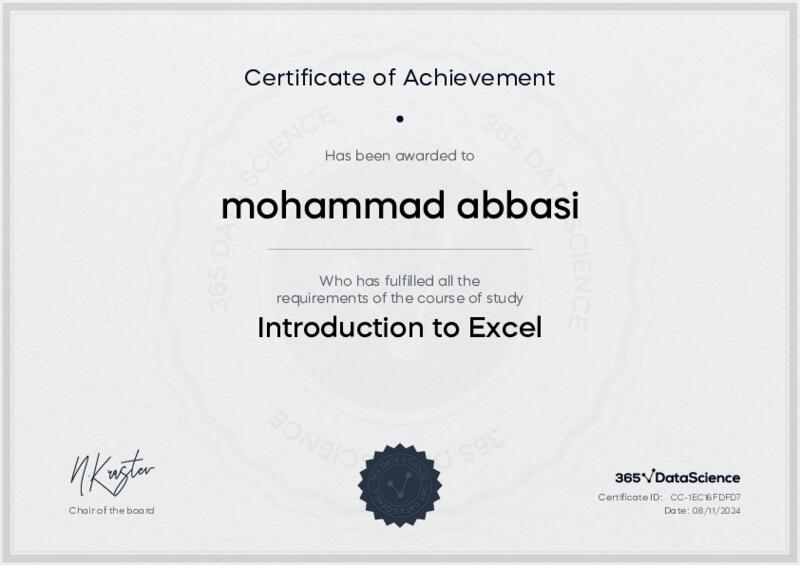This user has been awarded the Introduction to Excel Certificate for successfully completing the course exam. Holding this certificate demonstrates their proficiency on the topic and signifies they are qualified to apply their newly acquired expertise in the fields of data analytics and data science.