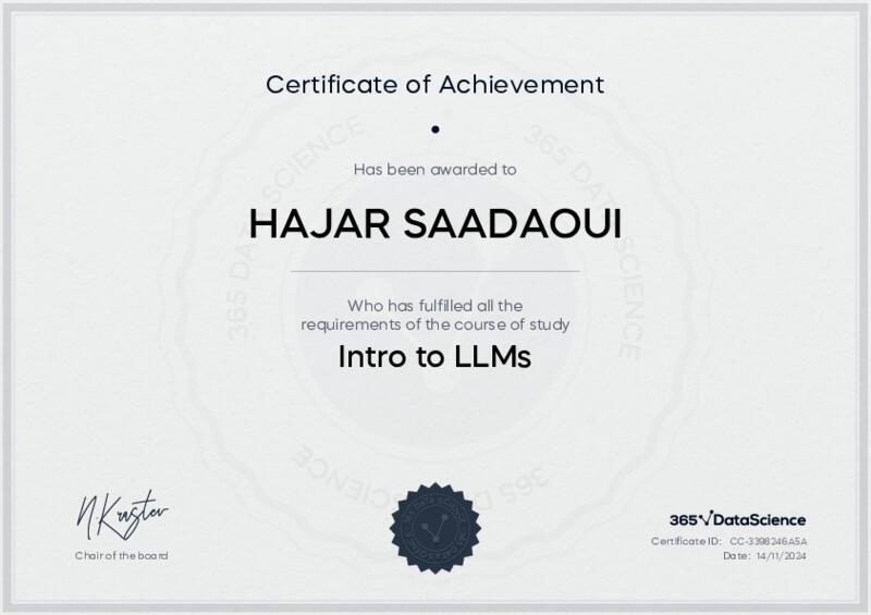 This user has been awarded the Intro to LLMs Certificate for successfully completing the course exam. Holding this certificate demonstrates their proficiency on the topic and signifies they are qualified to apply their newly acquired expertise in the fields of data analytics and data science.