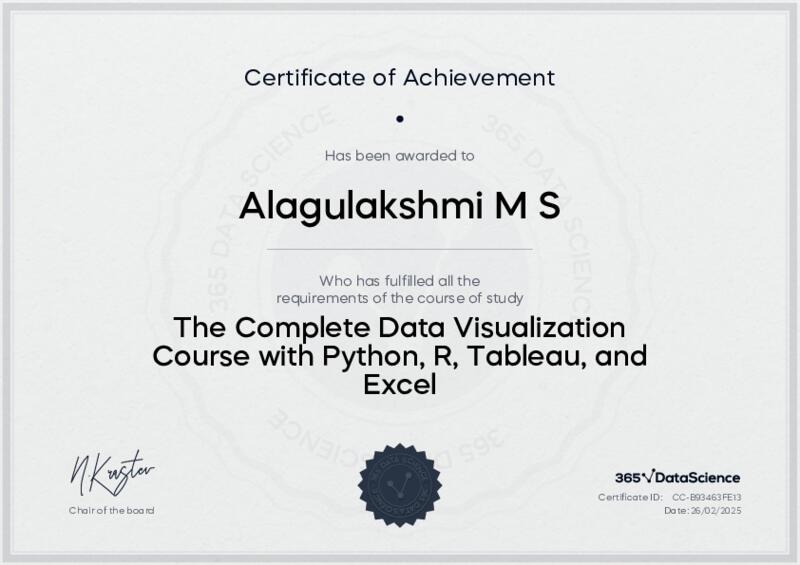 This user has been awarded the The Complete Data Visualization Course with Python, R, Tableau, and Excel Certificate for successfully completing the course exam. Holding this certificate demonstrates their proficiency on the topic and signifies they are qualified to apply their newly acquired expertise in the fields of data analytics and data science.