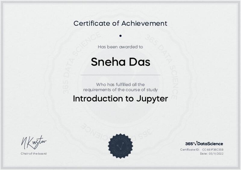 This user has been awarded the Introduction to Jupyter Certificate for successfully completing the course exam. Holding this certificate demonstrates their proficiency on the topic and signifies they are qualified to apply their newly acquired expertise in the fields of data analytics and data science.
