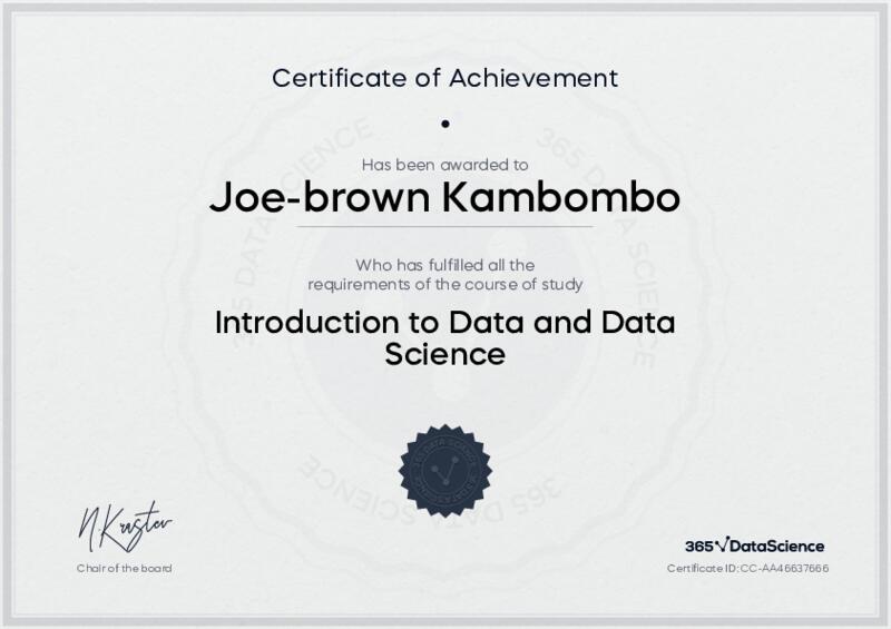 This user has been awarded the Introduction to Data and Data Science Certificate for successfully completing the course exam. Holding this certificate demonstrates their proficiency on the topic and signifies they are qualified to apply their newly acquired expertise in the fields of data analytics and data science.