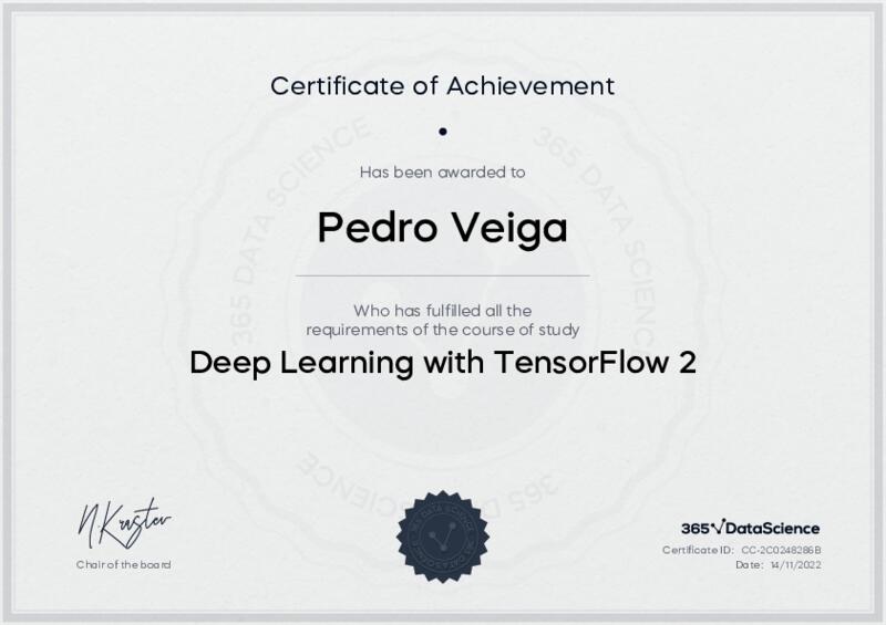 This user has been awarded the Deep Learning with TensorFlow 2 Certificate for successfully completing the course exam. Holding this certificate demonstrates their proficiency on the topic and signifies they are qualified to apply their newly acquired expertise in the fields of data analytics and data science.
