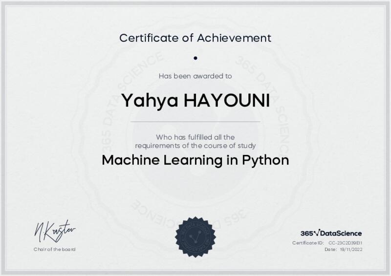 This user has been awarded the Machine Learning in Python Certificate for successfully completing the course exam. Holding this certificate demonstrates their proficiency on the topic and signifies they are qualified to apply their newly acquired expertise in the fields of data analytics and data science.