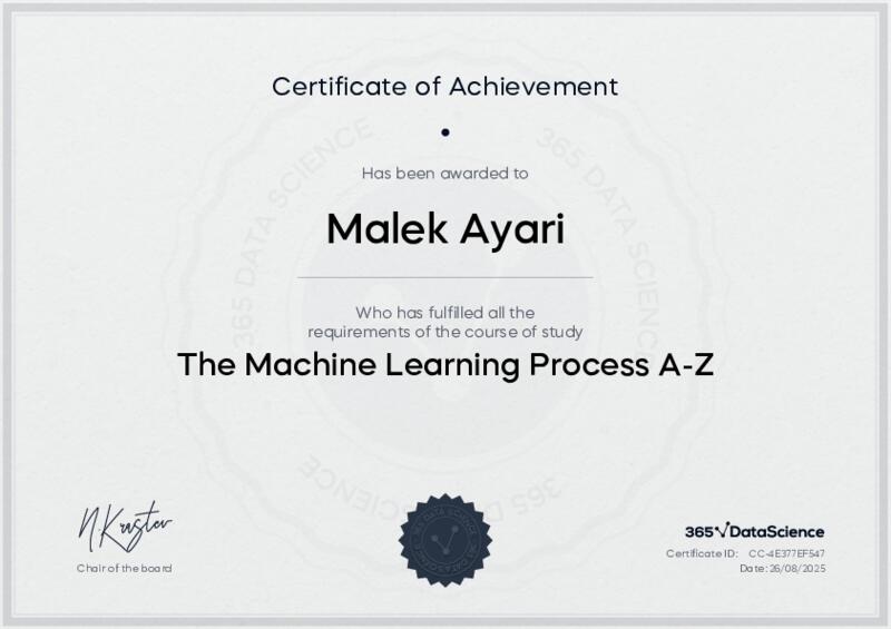 This user has been awarded the The Machine Learning Process A-Z Certificate for successfully completing the course exam. Holding this certificate demonstrates their proficiency on the topic and signifies they are qualified to apply their newly acquired expertise in the fields of data analytics and data science.