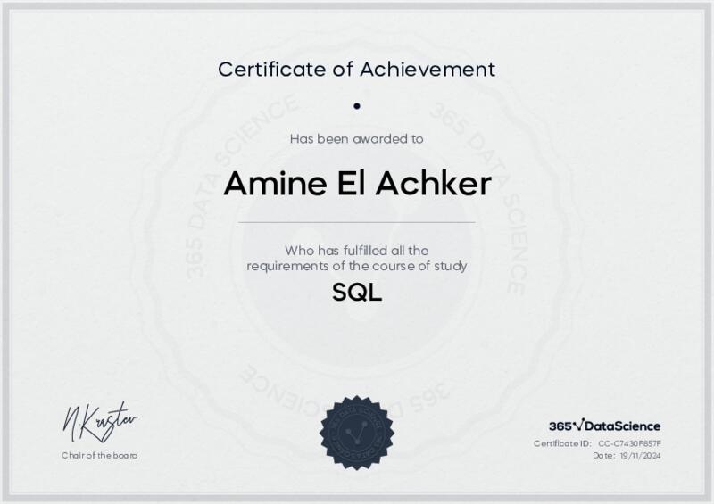 This user has been awarded the SQL Certificate for successfully completing the course exam. Holding this certificate demonstrates their proficiency on the topic and signifies they are qualified to apply their newly acquired expertise in the fields of data analytics and data science.
