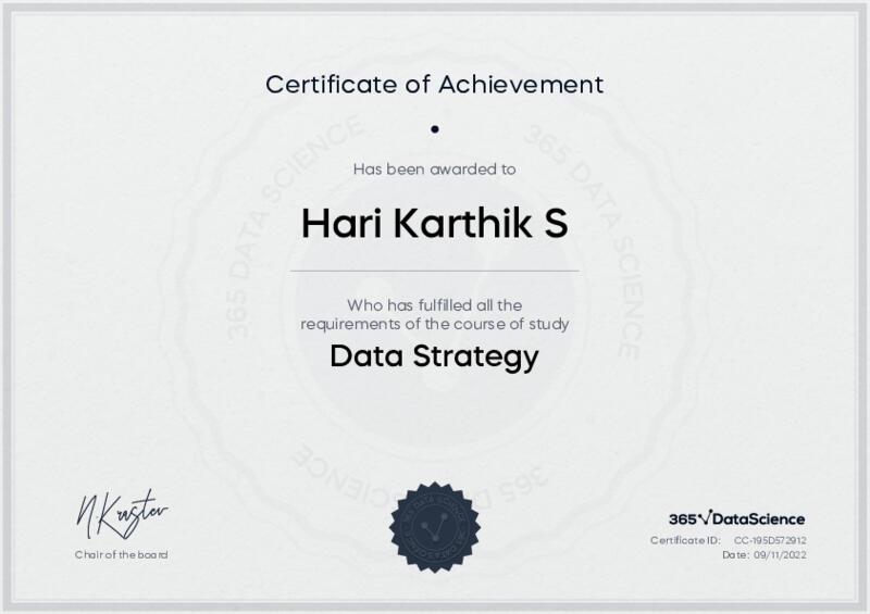 This user has been awarded the Data Strategy Certificate for successfully completing the course exam. Holding this certificate demonstrates their proficiency on the topic and signifies they are qualified to apply their newly acquired expertise in the fields of data analytics and data science.