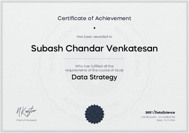 This user has been awarded the Data Strategy Certificate for successfully completing the course exam. Holding this certificate demonstrates their proficiency on the topic and signifies they are qualified to apply their newly acquired expertise in the fields of data analytics and data science.