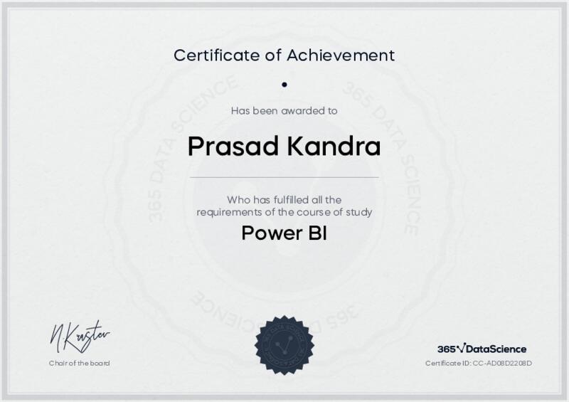 This user has been awarded the Power BI Certificate for successfully completing the course exam. Holding this certificate demonstrates their proficiency on the topic and signifies they are qualified to apply their newly acquired expertise in the fields of data analytics and data science.