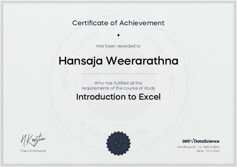 This user has been awarded the Introduction to Excel Certificate for successfully completing the course exam. Holding this certificate demonstrates their proficiency on the topic and signifies they are qualified to apply their newly acquired expertise in the fields of data analytics and data science.