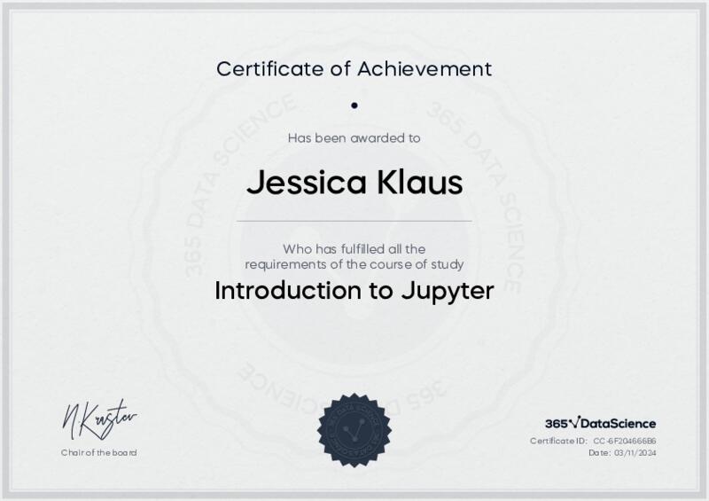This user has been awarded the Introduction to Jupyter Certificate for successfully completing the course exam. Holding this certificate demonstrates their proficiency on the topic and signifies they are qualified to apply their newly acquired expertise in the fields of data analytics and data science.