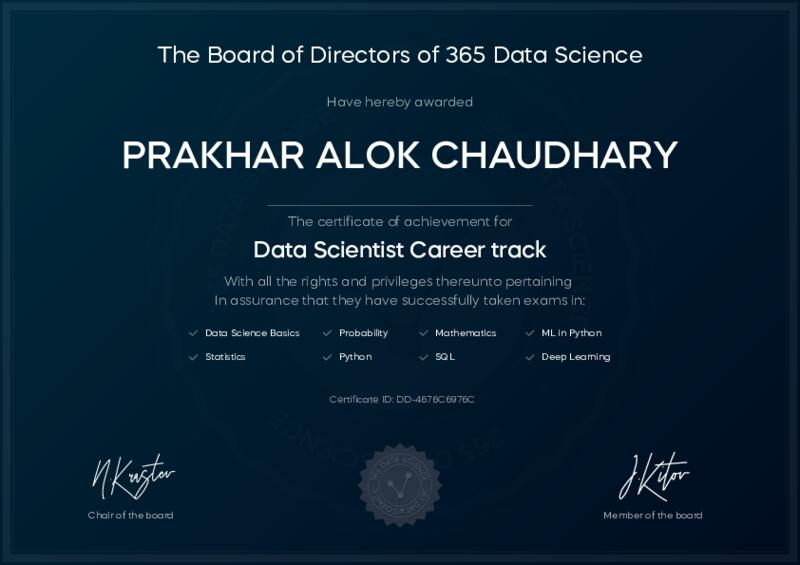 This user has been awarded the Data Scientist Career Track Certificate for successfully completing all courses and assessments. This certificate confirms their technical expertise and professional credibility to work as a data scientist.