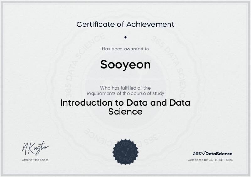 This user has been awarded the Introduction to Data and Data Science Certificate for successfully completing the course exam. Holding this certificate demonstrates their proficiency on the topic and signifies they are qualified to apply their newly acquired expertise in the fields of data analytics and data science.