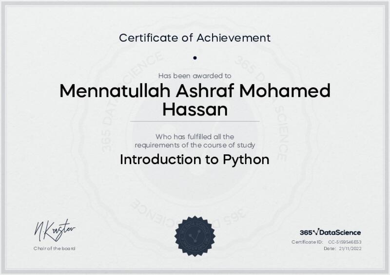 This user has been awarded the Introduction to Python Certificate for successfully completing the course exam. Holding this certificate demonstrates their proficiency on the topic and signifies they are qualified to apply their newly acquired expertise in the fields of data analytics and data science.