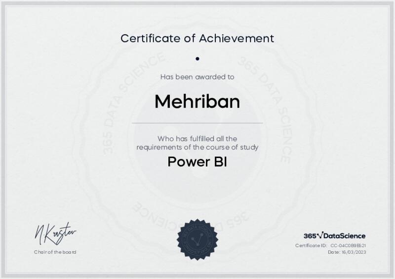 This user has been awarded the Power BI Certificate for successfully completing the course exam. Holding this certificate demonstrates their proficiency on the topic and signifies they are qualified to apply their newly acquired expertise in the fields of data analytics and data science.