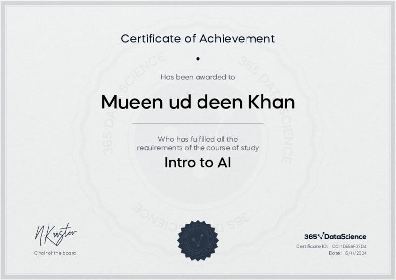This user has been awarded the Intro to AI Certificate for successfully completing the course exam. Holding this certificate demonstrates their proficiency on the topic and signifies they are qualified to apply their newly acquired expertise in the fields of data analytics and data science.