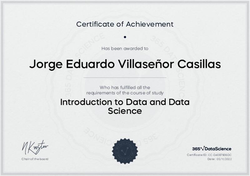 This user has been awarded the Introduction to Data and Data Science Certificate for successfully completing the course exam. Holding this certificate demonstrates their proficiency on the topic and signifies they are qualified to apply their newly acquired expertise in the fields of data analytics and data science.