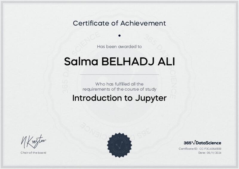 This user has been awarded the Introduction to Jupyter Certificate for successfully completing the course exam. Holding this certificate demonstrates their proficiency on the topic and signifies they are qualified to apply their newly acquired expertise in the fields of data analytics and data science.