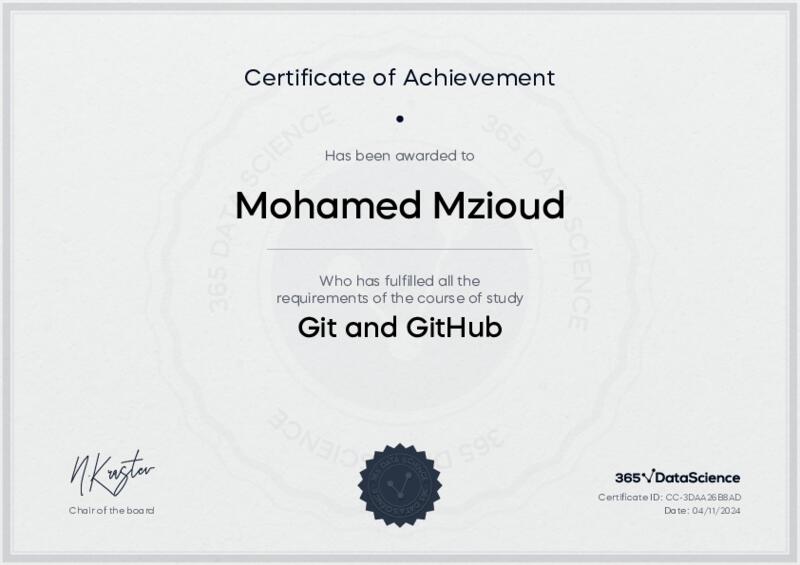 This user has been awarded the Git and GitHub Certificate for successfully completing the course exam. Holding this certificate demonstrates their proficiency on the topic and signifies they are qualified to apply their newly acquired expertise in the fields of data analytics and data science.