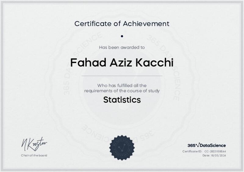 This user has been awarded the Statistics Certificate for successfully completing the course exam. Holding this certificate demonstrates their proficiency on the topic and signifies they are qualified to apply their newly acquired expertise in the fields of data analytics and data science.