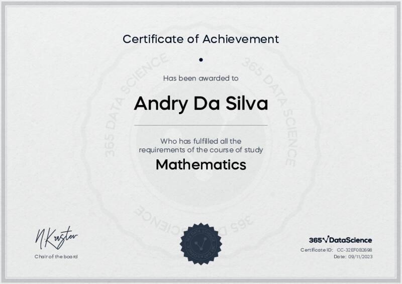 This user has been awarded the Mathematics Certificate for successfully completing the course exam. Holding this certificate demonstrates their proficiency on the topic and signifies they are qualified to apply their newly acquired expertise in the fields of data analytics and data science.