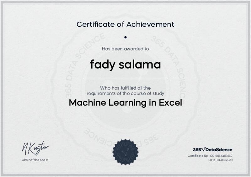 This user has been awarded the Machine Learning in Excel Certificate for successfully completing the course exam. Holding this certificate demonstrates their proficiency on the topic and signifies they are qualified to apply their newly acquired expertise in the fields of data analytics and data science.