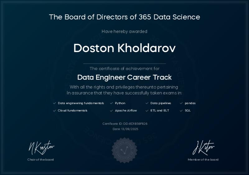 This user has been awarded the Data Engineer Career Track Certificate for successfully completing all courses and assessments. This certificate confirms their technical expertise and professional credibility to work as a data engineer.