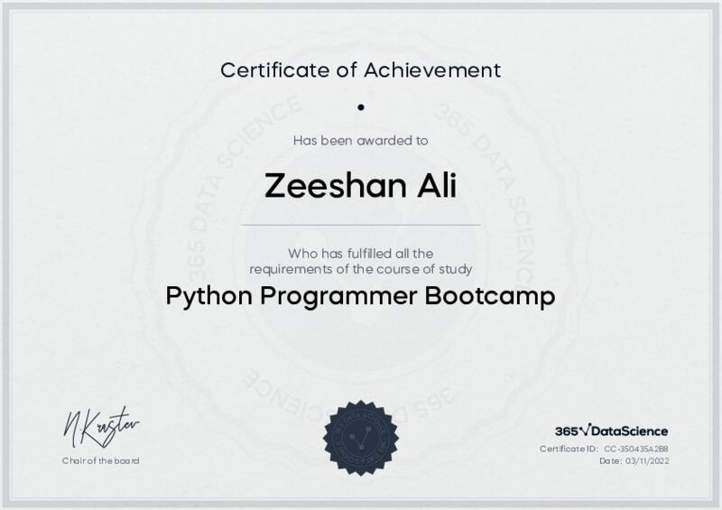 This user has been awarded the Python Programmer Bootcamp Certificate for successfully completing the course exam. Holding this certificate demonstrates their proficiency on the topic and signifies they are qualified to apply their newly acquired expertise in the fields of data analytics and data science.