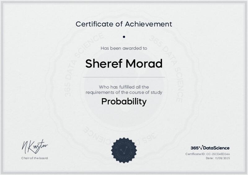 This user has been awarded the Probability Certificate for successfully completing the course exam. Holding this certificate demonstrates their proficiency on the topic and signifies they are qualified to apply their newly acquired expertise in the fields of data analytics and data science.