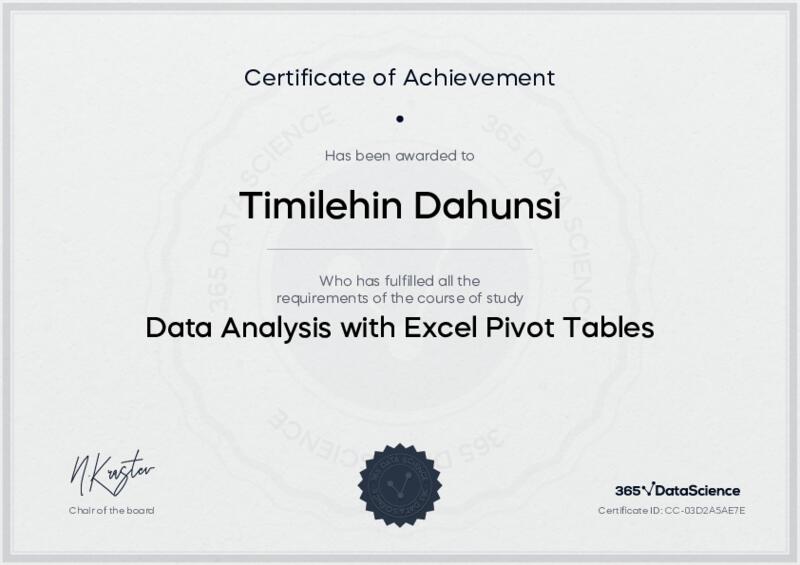This user has been awarded the Data Analysis with Excel Pivot Tables Certificate for successfully completing the course exam. Holding this certificate demonstrates their proficiency on the topic and signifies they are qualified to apply their newly acquired expertise in the fields of data analytics and data science.