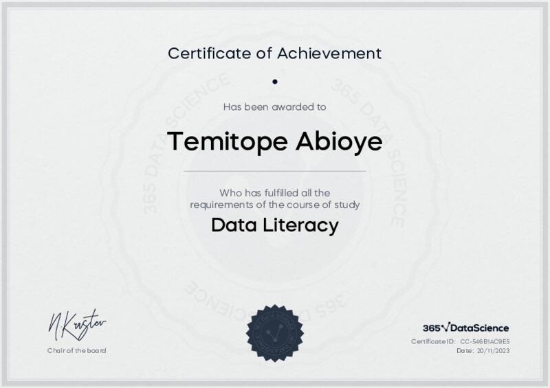 This user has been awarded the Data Literacy Certificate for successfully completing the course exam. Holding this certificate demonstrates their proficiency on the topic and signifies they are qualified to apply their newly acquired expertise in the fields of data analytics and data science.