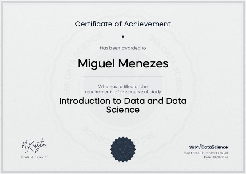 This user has been awarded the Introduction to Data and Data Science Certificate for successfully completing the course exam. Holding this certificate demonstrates their proficiency on the topic and signifies they are qualified to apply their newly acquired expertise in the fields of data analytics and data science.