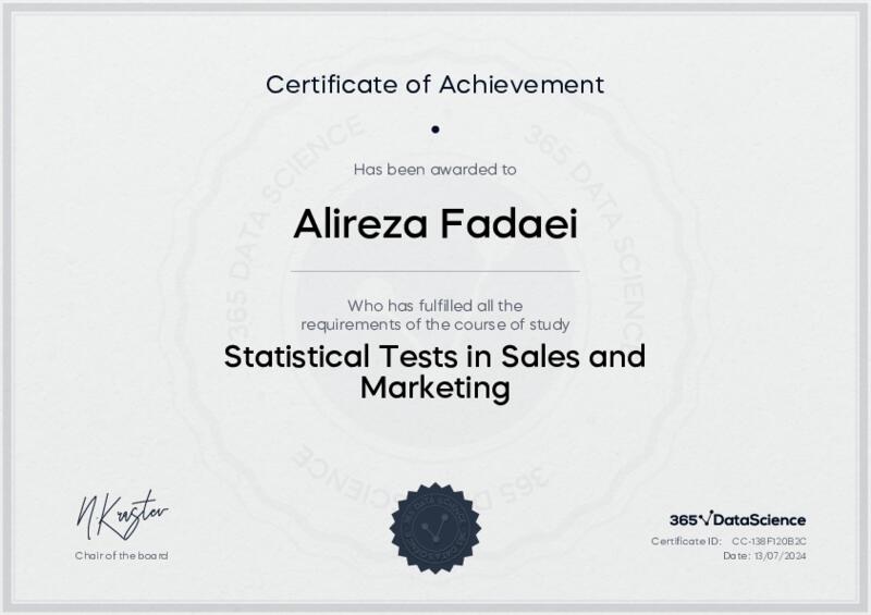 This user has been awarded the Statistical Tests in Sales and Marketing Certificate for successfully completing the course exam. Holding this certificate demonstrates their proficiency on the topic and signifies they are qualified to apply their newly acquired expertise in the fields of data analytics and data science.