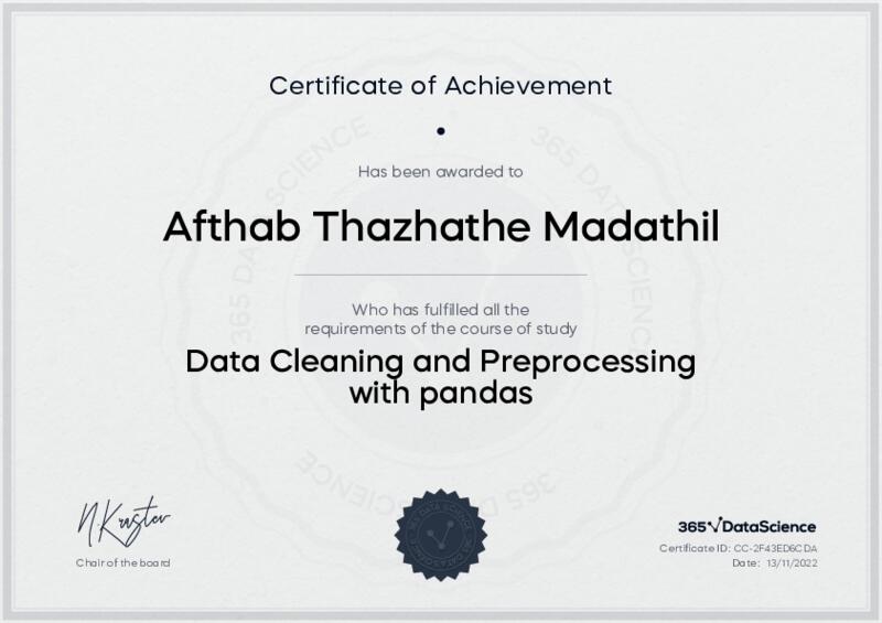 This user has been awarded the Data Cleaning and Preprocessing with pandas Certificate for successfully completing the course exam. Holding this certificate demonstrates their proficiency on the topic and signifies they are qualified to apply their newly acquired expertise in the fields of data analytics and data science.