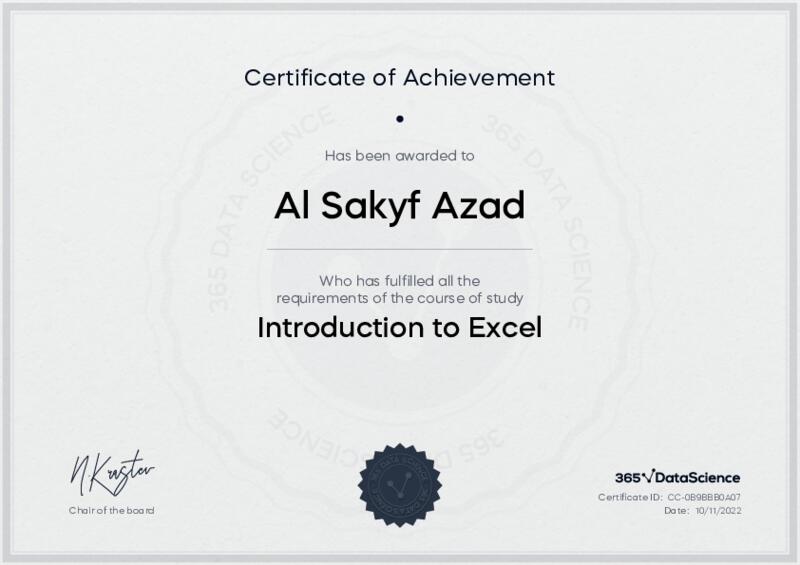 This user has been awarded the Introduction to Excel Certificate for successfully completing the course exam. Holding this certificate demonstrates their proficiency on the topic and signifies they are qualified to apply their newly acquired expertise in the fields of data analytics and data science.
