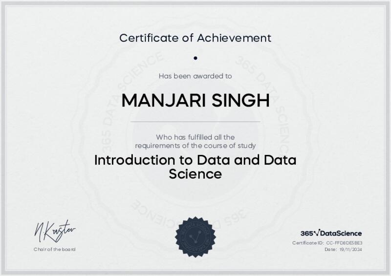This user has been awarded the Introduction to Data and Data Science Certificate for successfully completing the course exam. Holding this certificate demonstrates their proficiency on the topic and signifies they are qualified to apply their newly acquired expertise in the fields of data analytics and data science.