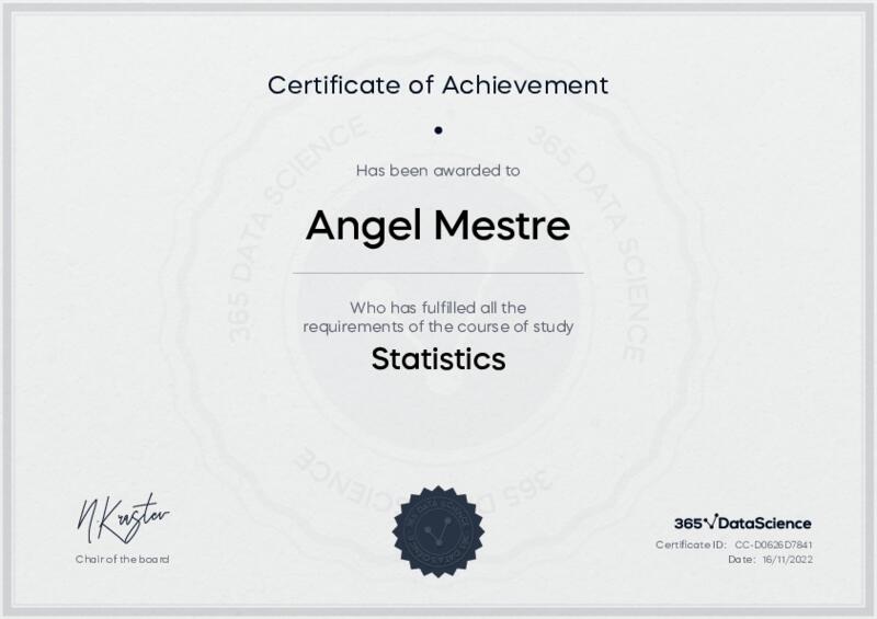 This user has been awarded the Statistics Certificate for successfully completing the course exam. Holding this certificate demonstrates their proficiency on the topic and signifies they are qualified to apply their newly acquired expertise in the fields of data analytics and data science.