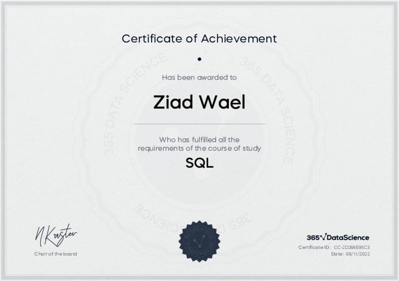 This user has been awarded the SQL Certificate for successfully completing the course exam. Holding this certificate demonstrates their proficiency on the topic and signifies they are qualified to apply their newly acquired expertise in the fields of data analytics and data science.