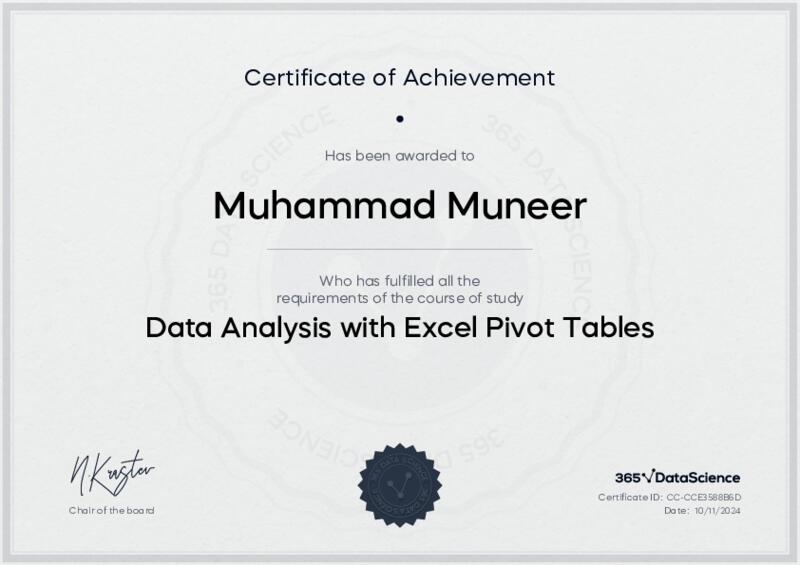 This user has been awarded the Data Analysis with Excel Pivot Tables Certificate for successfully completing the course exam. Holding this certificate demonstrates their proficiency on the topic and signifies they are qualified to apply their newly acquired expertise in the fields of data analytics and data science.