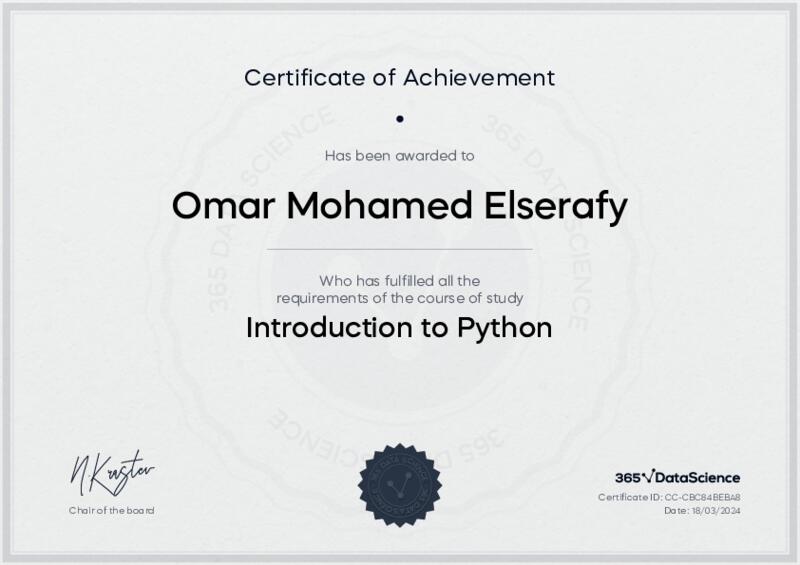 This user has been awarded the Introduction to Python Certificate for successfully completing the course exam. Holding this certificate demonstrates their proficiency on the topic and signifies they are qualified to apply their newly acquired expertise in the fields of data analytics and data science.