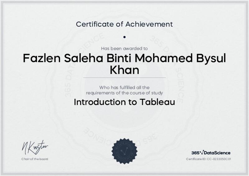 This user has been awarded the Introduction to Tableau Certificate for successfully completing the course exam. Holding this certificate demonstrates their proficiency on the topic and signifies they are qualified to apply their newly acquired expertise in the fields of data analytics and data science.