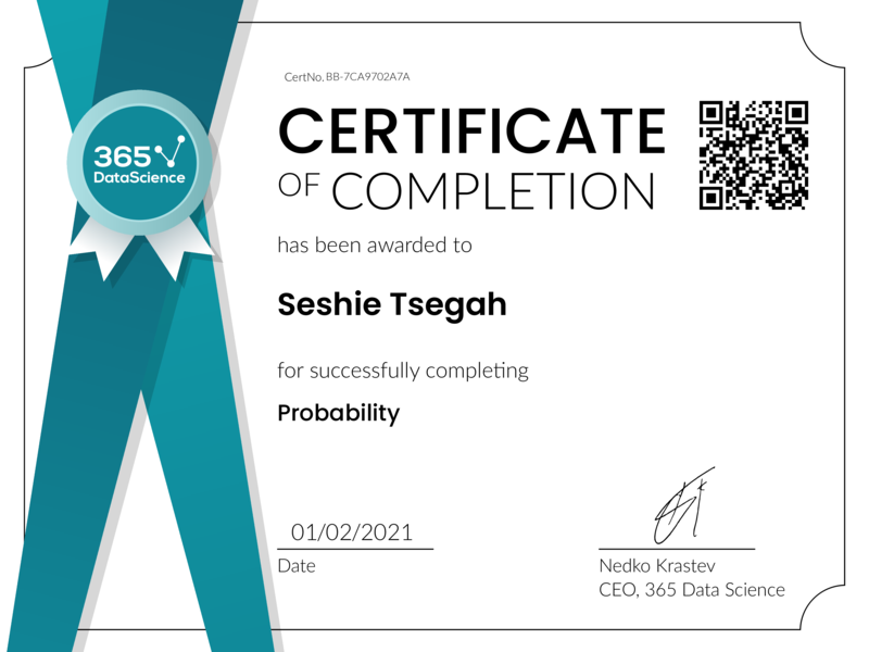 Congratulations! You have been awarded the 365 Data Science Certificate for successfully completing this course. Holding this certificate demonstrates your proficiency on the topic and your ability to apply your newly acquired expertise in the fields of data analytics and data science with confidence.