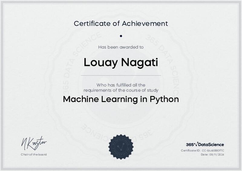 This user has been awarded the Machine Learning in Python Certificate for successfully completing the course exam. Holding this certificate demonstrates their proficiency on the topic and signifies they are qualified to apply their newly acquired expertise in the fields of data analytics and data science.