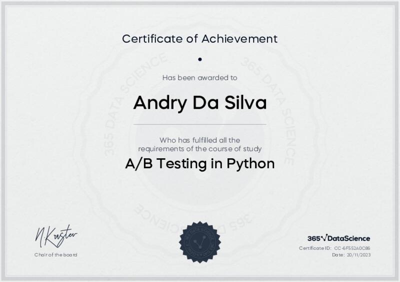 This user has been awarded the A/B Testing in Python Certificate for successfully completing the course exam. Holding this certificate demonstrates their proficiency on the topic and signifies they are qualified to apply their newly acquired expertise in the fields of data analytics and data science.