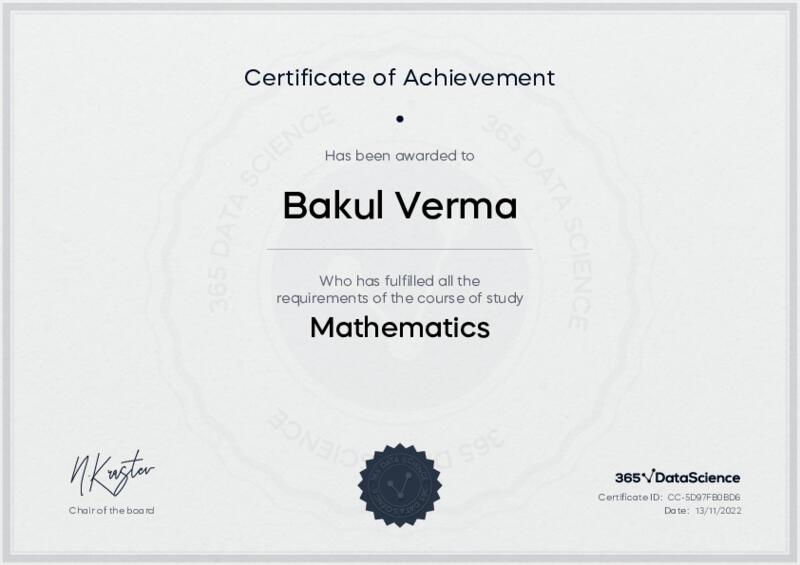 This user has been awarded the Mathematics Certificate for successfully completing the course exam. Holding this certificate demonstrates their proficiency on the topic and signifies they are qualified to apply their newly acquired expertise in the fields of data analytics and data science.
