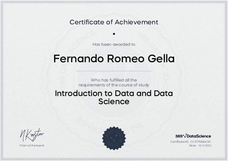 This user has been awarded the Introduction to Data and Data Science Certificate for successfully completing the course exam. Holding this certificate demonstrates their proficiency on the topic and signifies they are qualified to apply their newly acquired expertise in the fields of data analytics and data science.