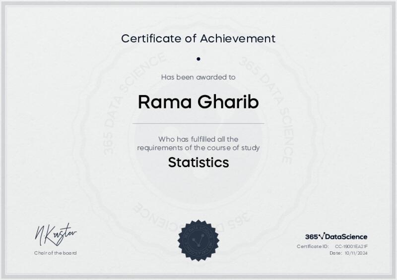 This user has been awarded the Statistics Certificate for successfully completing the course exam. Holding this certificate demonstrates their proficiency on the topic and signifies they are qualified to apply their newly acquired expertise in the fields of data analytics and data science.