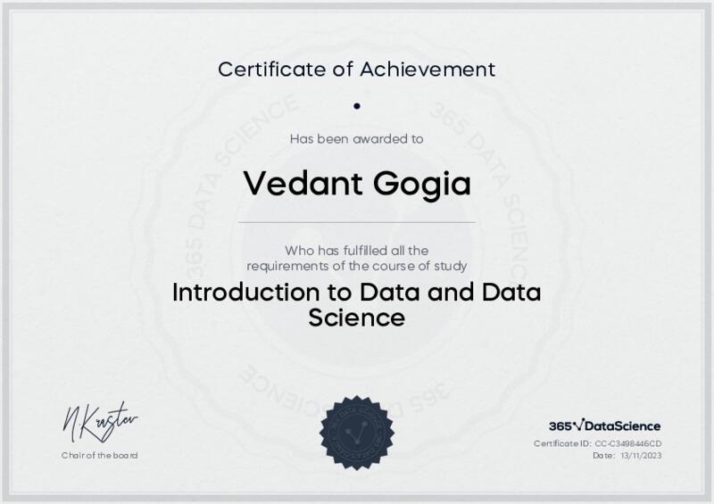 This user has been awarded the Introduction to Data and Data Science Certificate for successfully completing the course exam. Holding this certificate demonstrates their proficiency on the topic and signifies they are qualified to apply their newly acquired expertise in the fields of data analytics and data science.