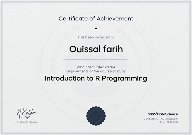 This user has been awarded the Introduction to R Programming Certificate for successfully completing the course exam. Holding this certificate demonstrates their proficiency on the topic and signifies they are qualified to apply their newly acquired expertise in the fields of data analytics and data science.